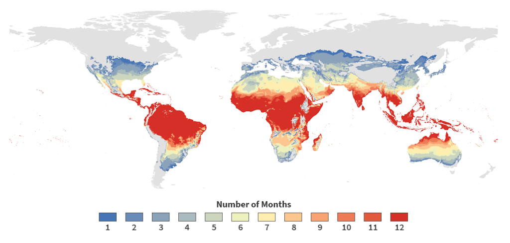 Changes in weather also affect animal and insect behaviour, disrupt habitats and pollute environments. These factors have many repercussions, as water can become contaminated, leading to worse sanitation, resulting in more water-borne diseases such as cholera spreading more. Rainfall can also influence the transport and dissemination of infectious agents, while temperature affects their growth and survival. Globally, temperature increases of 2-3ºC would increase the number of people who, in climatic terms, are at risk of malaria by around 3- 5%, i.e., several hundred million. Furthermore, the seasonal duration of malaria would increase in many currently endemic areas. To analyse the issue, landscape-based modelling has been applied to estimate how future climate-induced changes in ground cover and surface water in Africa would affect mosquitoes and tsetse flies and, hence, malaria and African sleeping sickness. However, Africa is not only affected; as colder countries become warmer, vectors are finding more habitable places to stay which means that they will become a world problem. This is proven by mosquito populations arising in the south of the United States. In the diagram below, we can see that mosquitoes are slowly encroaching into Europe as well.